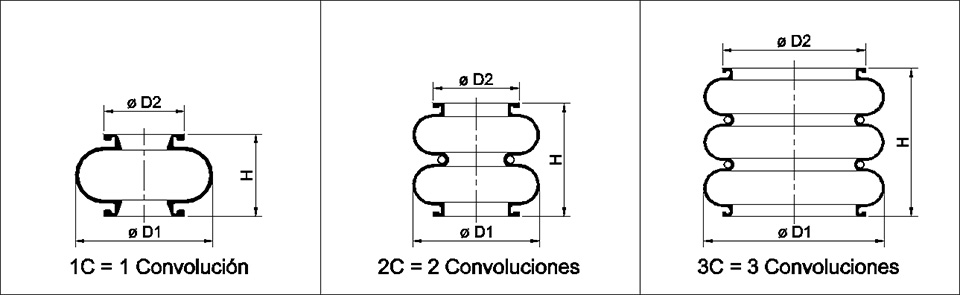 Descripción: Es un depósito de aire completo, integrado y armado por el fuelle de convoluciones con tapas atornilladas a bridas metálicas formando una unidad lista para ser montada en el vehículo. En este producto se puede cambiar el fuelle de goma con piezas de repuestos. Las tapas están provistas de los elementos necesarios para la entrada-salida de aire y el anclaje al vehículo; y son de distintos tipos para cubrir una amplia gama de vehículos, marcas y mecanismos de suspensión. La línea estándar de NeumaCarg se ha desarrollado para fuelles de 1, 2 o 3 convoluciones o lóbulos.